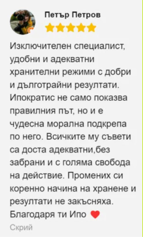 Винаги, когато имаш въпрос – аз, Ипократис, ще съм насреща и ще следя прогреса ти отблизо. През профила си ще можеш да се свързваш с мен, когато пожелаеш и заедно да решаваме всички възникнали въпроси.
