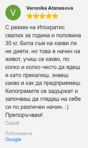 ...Стартирах с 85 кг. Днес съм 78 кг. Няма да акцентирам върху това, че дрехите ми стоят къде-къде по-елегантно, но ще акцентирам върху факта, че кръвното ми се върна в нормални граници, че спя по-добре, че съм по- подвижна и, че ми е хубаво. Благодаря на Ипократис и екипа му за това, че бяха до мен и се съобразяваха с мен!
