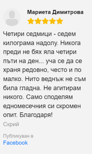 Това e режимът, с който постигам целта си да се чувствам прекрасно в тялото си. Искам да благодаря от сърце за постигнатите прекрасни резултати и да вмъкна , че дори понякога да си хапна нещо сладко то не се отразява на теглото ми. Метаболизма ми най-накрая се събуди Препоръчвам!